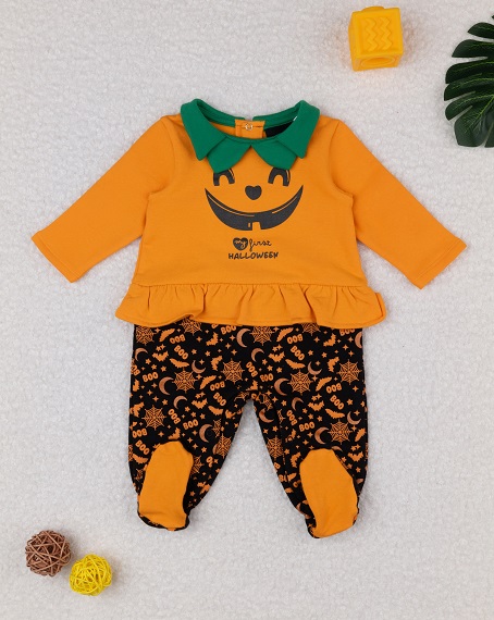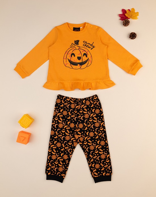 Nella versione femminile, la proposta si compone di una maglia a maniche lunghe arancione, impreziosita da una zucca stampata e bottoni automatici, abbinata a pantaloni neri con una fantasia allover di piccoli disegni in tinta.
