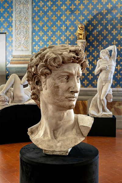 Di grande suggestione è la presentazione di una sorta di gipsoteca dedicata a Michelangelo, con calchi di alcune delle sue opere maggiori, legate tutte per varie ragioni ai rapporti dell’artista con i grandi dell’epoca: come il calco dell’Angelo reggicandelabro, eseguito a Bologna dove venne protetto dal nobile Francesco Aldrovandi, quello del Bacco commissionato all’artista dal cardinale Riario, nipote di Sisto IV, la riproduzione in gesso della Pietà Vaticana, realizzata a Roma peril cardinale Jean Bilhères De Lagraulas la copia monumentale della testa del David di Piazza Signoria, i due Schiavi (il Barbuto e il Morente), la Notte delle Cappelle Medicee, una delle sculture scolpite per celebrare i duchi Medici, Lorenzo e Giuliano. Tra queste testimonianze indirette anche una riproduzione semprein gesso del Busto di Michelangelo, eseguita a partire dall’originale di Daniela da Volterra.