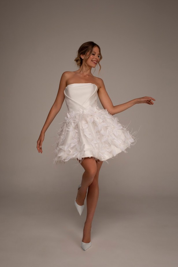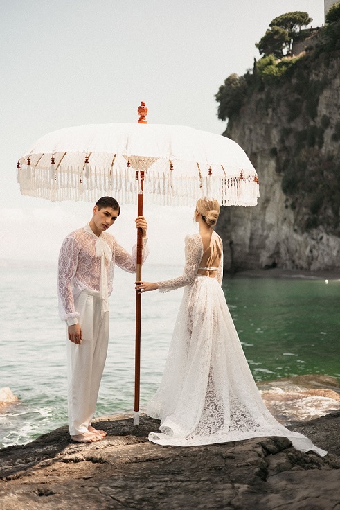 Cascate di fiori, dettagli di colori intensi, come il viola, il verde smeraldo e il nero arricchiscono gli abiti dell’Atelier Miryam Pieralisi che propone abiti sartoriali disponendo, altresì, di un’ampia scelta personalizzata e così, accanto alle silhouette più classiche, come quelle da principessa, con bustier sagomati stecche a vista pizzo chantilly e gonna ampia, e quelle morbide e a sirena, regnano quelle aderenti e a tubo. Immancabile la linea svasata, utilizzata soprattutto su abiti essenziali e dal mood minimalista, e abiti a due pezzi, dettagli di piume, tantissimi ricami, abiti corti. La femminilità è esaltata dall’utilizzo di pizzi floreali anche nella collezione 2025 di Elvira Gramano, con schiene velate e ornate di fiori che rendono romantico e malizioso il modello.