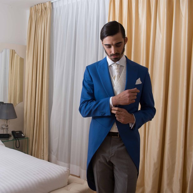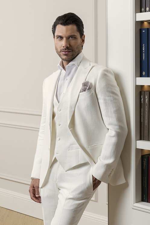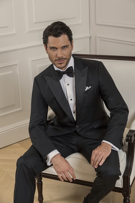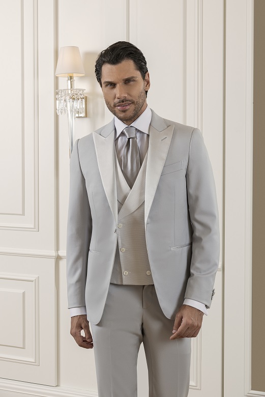 Per lo sposo le collezioni restano ispirate alla tradizione dell’alta sartoria ma si reinventano presentando una versione aggiornata nel colore. Carosi presenta a RomaSposa 2024 il Frac corto nel blu Navy in tessuto faille di lana, con trattamento shining che lo rende più prezioso e lucente, senza utilizzare materiali sintetici, e realizzato in natural strech, associato a un gilet perla anziché bianco e papillon dello stesso tessuto, un capo dal grande fascino per la sera rivisitato in chiave moderna. Altra novità riguarda lo smoking – sempre più richiesto dagli sposi anche se il suo uso nasce non per una cerimonia religiosa ma per un evento serale di gran galà – presentato in varie sfumature per renderlo adatto al rito: dal blu scuro in lana satin con revers petto a lancia in tessuto lamé per la sera, una nota vezzosa per chi ama vivere la propria cerimonia come un vero party, al colore champagne con revers sciallati in seta beige, abbinato a gilet e papillon in raso di seta beige, ideale per coloro che optano, ad esempio, per un matrimonio country chic oppure con una location sul mare. Altra novità in mostra a Romasposa 2024 l’abito color pavone in misto lana con petto a lancia, un po’ più lungo dello standard, con un dettaglio molto particolare: il taglio del fondo giacca con un motivo a trapezio, abbinato al gilet ad un petto e mezzo sui toni dei grigi e relativo papillon dello stesso tessuto.
