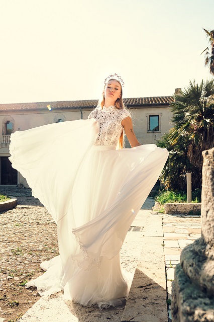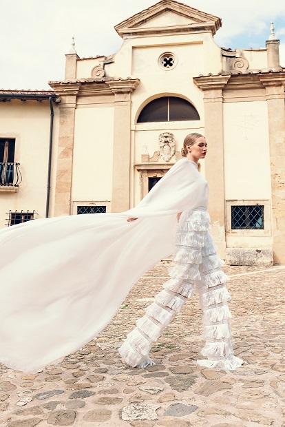 Sempre più amati dalle future spose, anche questi per la possibilità di essere indossati nuovamente, sono gli abiti trasformabili o componibili: per la collezione collezione Goddess Divine di Antonella Rossi la parola d’ordine è “libertà”. Le donne contemporanee hanno voglia di leggerezza per muoversi e vivere a pieno il proprio matrimonio, poco importa se la scelta poi ricadrà su chiffon, cady, organza o mikado. Ecco il successo degli abiti trasformabili, che possono evolversi durante l’evento, in due o tre pezzi: da slip dress in cady con soprabito interamente ricamato a cappa in doppio georgette, boustier e pantalone con frange. Spazio anche a body e gonna vaporosa ma con seconda versione super corta e frizzante. Tutto questo per non arrivare necessariamente al cambio abito vero e proprio e a dare più vite al proprio outfit da sposa, facilitandone il riutilizzo. L’accessorio regna poi sovrano tra tiare dal sapore romantico e senza tempo, stilosi cuff per le orecchie in oro e argento, grandi fiocchi in raso e velluto. Sempre più proposti e utilizzati anche maxi orecchini con fiori che richiamano l’abito, collant e gambaletti in pizzo, iconici guanti (corti o lunghi). Sempre chic, velette e veli corti, molto sbarazzini.