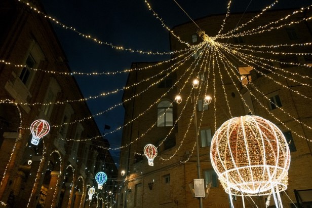 Le vie e le piazze del centro storico sono il cuore pulsante di questa storica festa, animata da spettacoli, artisti di strada, mercatini e installazioni luminose. Un tripudio di luci, colori e decorazioni scenografiche, con figure tridimensionali e tappeti luminosi, che trasformano questo piccolo gioiello, circondato da una poderosa cinta muraria di quasi 1 km ottimamente conservata, in una meta unica e irresistibile, dove architetture iconiche e scorci suggestivi, come la celebre scalinata del Pozzo della Polenta e il nuovo affaccio sulla Piazzetta della Rotonda, si trasformano in scenari fiabeschi.