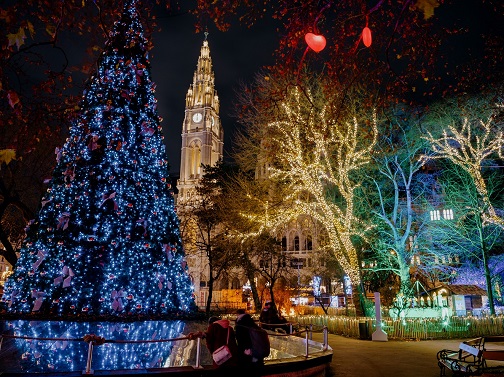 Quando si parla di atmosfere natalizie, Vienna è una delle più eleganti destinazioni che vengono in mente. Le 32 vie dello shopping viennese vengono addobbate con più di due milioni di luci che illuminano la capitale ogni sera. Da Annagasse con le note iniziali di “Silent Night” fino alle classiche bolle rosse in Rotenturmstrasse, senza dimenticare Servitengasse, dove le luci si districano tra gli alberi, tutte le decorazioni conducono al Rathauspark, il parco del municipio, dove, tra i tanti alberi addobbati e illuminati, spicca l’albero dei cuori, un classico del natale viennese, soprattutto per tutte le coppie che vogliono dedicarsi un momento romantico.