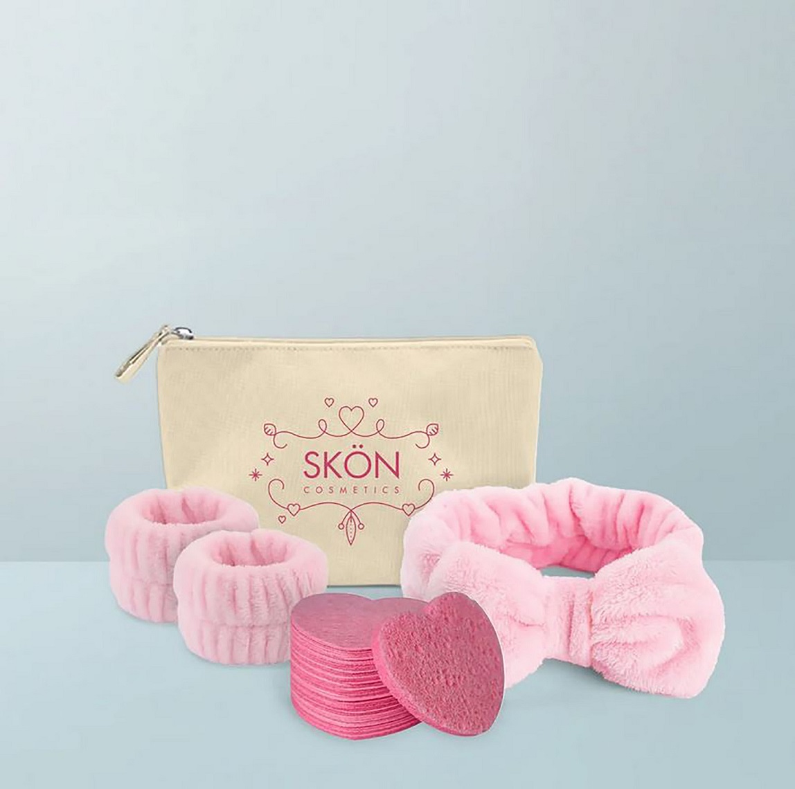 Romantico set, con beauty porta-creme in limited edition, una morbida fascetta skincare, i carinissimi polsini rosa e due morbide spugnette per detergere il viso a forma di cuore. Da usare e riutilizzare, senza sprechi.