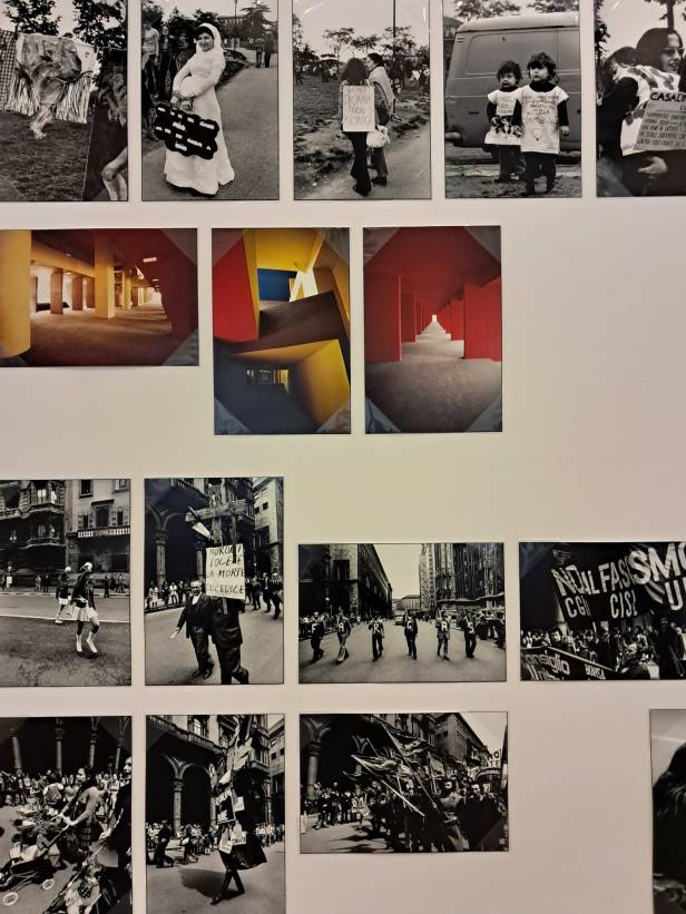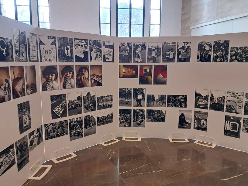 L’allestimento circolare della mostra ne consentì una fruizione su quattro livelli tematici. Manifestazioni femministe, occupazioni di case, eventi legati al referendum e campagne sociali promosse da gruppi spontanei furono al centro delle 134 fotografie perlopiù in bianco e nero disposte su strisce sovrapposte all’interno di dieci pannelli.