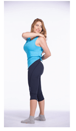 In piedi come nella prima figura, portare la mano destra sulla spalla sinistra mantenendo il gomito parallelo al suolo e poggiare il dorso della mano sinistra sul fianco sinistro facendo passare il braccio dietro la schiena. Mantieni il bacino allineato e frontale, la torsione è solo del busto, come nella seconda figura. Fai tre respiri profondi mantenendo la posizione, poi invertila portando la mano sinistra sulla spalla destra e il dorso della mano destra sul fianco sinistro, esegui tre respiri profondi. Ripeti almeno 10 volte o fino a quando non sentirai fuoriuscire la bolla d’aria o comunque un comfort gastrico. Puoi eseguire la strategia anche da seduto.