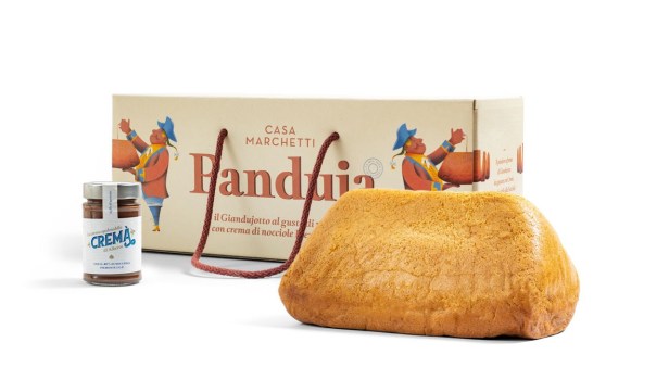 PANDUJA è Pandò, il soffice lievitato a forma di gianduiotto, accompagnato da Cremà, la spalmabile di Alberto, golosa e genuina, con polvere di latte 100% piemontese e nocciole Piemonte IGP.