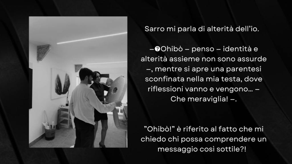 - Ohibò — penso — identità e alterità assieme non sono assurde —, mentre si apre una parentesi sconfinata nella mia testa, dove riflessioni vanno e vengono… — Che meraviglia! —.