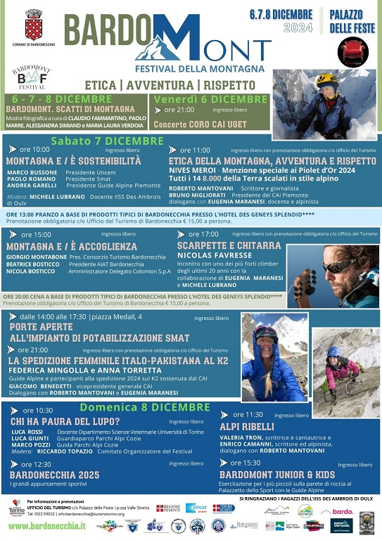 Sabato 7 dicembre dalle 14 alle 17,30 in piazza Medail 4 è in programma l’evento “Porte aperte all’impianto di potabilizzazione Smat”. Alle 13 e alle 20 sarà possibile pranzare o cenare con 15 euro, per gustare un menù a base di prodotti tipici di Bardonecchia all’hotel Des Geneys Splendid, con prenotazione obbligatoria all’Ufficio del Turismo. Domenica 8 alle 10,30 è in programma il dibattito sul tema “Chi ha paura del lupo?” con Luca Rossi, docente del Dipartimento Scienze Veterinarie dell’Università di Torino, Luca Giunti, agente dei Parchi Alpi Cozie, Marco Pozzi, guida dei Parchi Alpi Cozie. Moderatore dell’incontro sarà Riccardo Topazio. Alle 11,30 di “Alpi ribelli” parleranno la scrittrice e cantautrice Valeria Tron, lo scrittore e alpinista Enrico Camanni e Roberto Mantovani. Alle 12,30 nell’incontro “Bardonecchia 2025” si parlerà degli imminenti grandi appuntamenti sportivi, mentre alle 15,30 è in programma “Bardomont Junior & Kids”, un’esercitazione per i più piccoli sulla parete di roccia al Palazzetto dello Sport con le guide alpine.