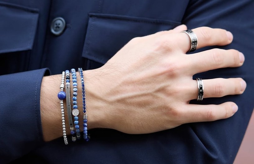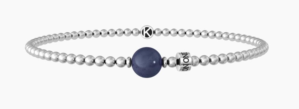 Bracciale elastico da uomo in acciaio con sodalite blu e elemento con scritta “One in a million”.