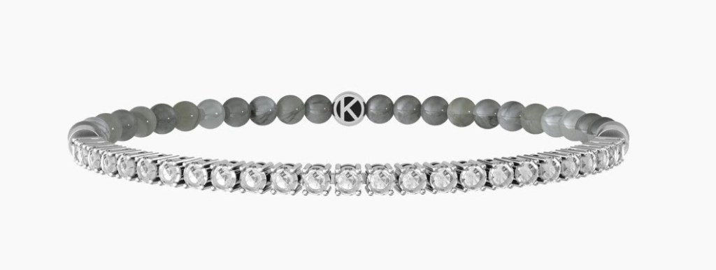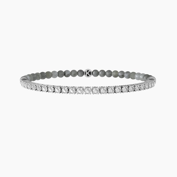 Bracciale elastico in acciaio con sfere di agata grigia striata satinata e tennis di zirconi bianchi.