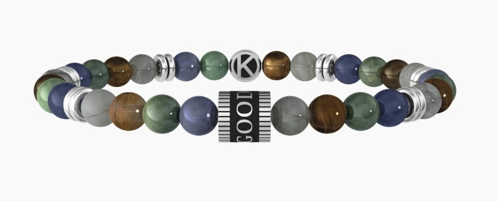 Bracciale elastico con pietre naturali multicolor e inserto in acciaio nero con scritta “Good luck”.