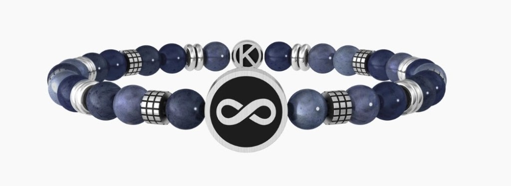 Bracciale elastico da uomo con sfere in acciaio lucido e satinato, black pvd e dumortierite blu con piastra tonda con simbolo dell’infinito e la scritta “family” sul retro.