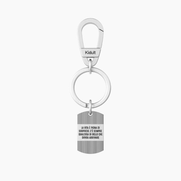 Portachiavi in acciaio satinato con ciondolo rettangolare, finitura rigata e scritta “La vita è piena di sorprese. C’è sempre qualcosa di bello che dovrà arrivare”.
