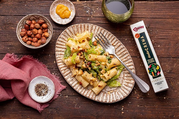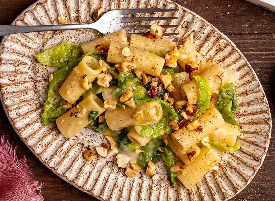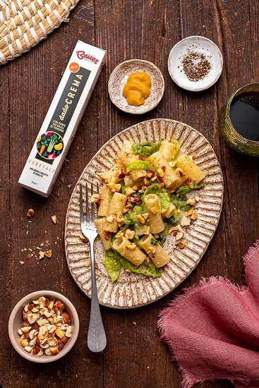 Rigatoni con crema di topinambur, verza e nocciole: Alice del Re del blog Pane, Libri e Nuvole ci propone un primo piatto perfetto per questi mesu. Stiamo parlando dei deliziosi rigatoni realizzati con crema di topinambur, verza e nocciole. Una ricetta capace di stupire i commensali, con quel tocco crunchy che il palato apprezza sempre. Il segreto di Alice per rendere questi rigatoni ancora più squisiti? DADOCREMA Vegetale Bauer, il dado in formato crema che ti svolta le ricette in un attimo.