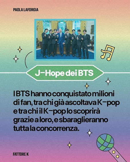Paola Laforgia che invece scrive “Fattore K”, dal 2021 vive a Seoul, dove lavora come consulente e promoter per l’etichetta discografica indipendente e attualmente conduce un programma mensile di sola musica sulla coreana VISLA.FM. È inoltre autrice di articoli sulla musica e la cultura pop coreana per Not, Norient, Kritika Kultura.