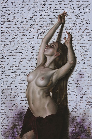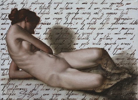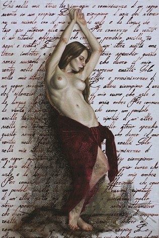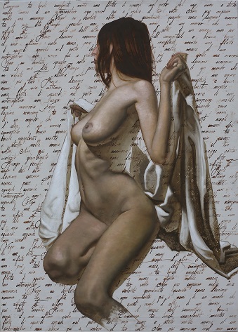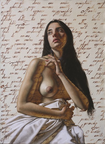 Opere essenziali e pulite che, nel presentare una figura singola in un campo fitto di scrittura, offrono lo spunto per riflettere sul rapporto millenario tra pittura e scrittura.