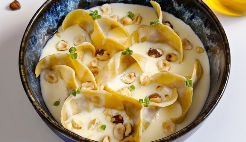 Adagia i ravioli nei piatti, versa sopra la fonduta di Taleggio D.O.P. e completa con le nocciole tostate