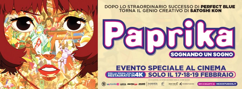 La nuova Stagione Anime al Cinema è un progetto esclusivo di Nexo Studios. L’appuntamento di PAPRIKA – SOGNANDO UN SOGNO è distribuito in collaborazione con i media partner Radio DEEJAY, Lucca Comics & Games, Cultura POP, MYmovies, ANiME GENERATION.