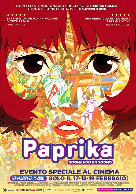 Dopo il successo di Perfect Blue, che lo scorso aprile ha portato al cinema 50mila spettatori, PAPRIKA – SOGNANDO UN SOGNO di Satoshi Kon (1963-2010), uno dei capolavori più acclamati dell’animazione giapponese, torna sul grande schermo per un evento speciale dal 17 al 19 febbraio (elenco sale a breve su https://www.nexostudios.it/movie/paprika-sognando-un-sogno/ e prevendite aperte dal 16 gennaio).