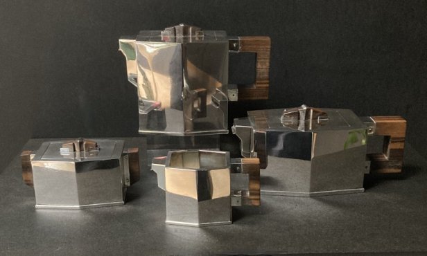 Cabinet of Curiosities – Honourable Silver Objects (oggetti decorativi): espone una scrivania Art Deco in ebano di Macassar e un set da tè e caffè realizzato dalla Maison Delheid negli anni ’30, con dettagli in legno di rosa.