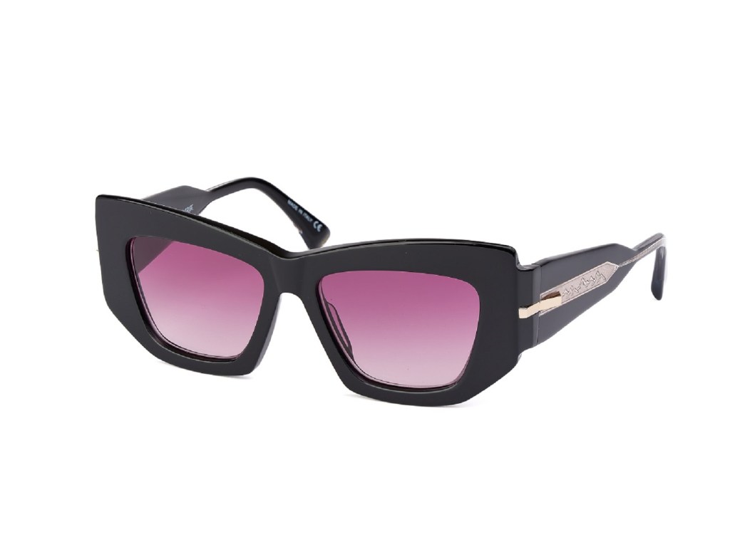 Con la sua forma iconica a gatto in acetato nero e lenti violette a contrasto, “Civetta” si distingue per i dettagli unici, come le aste con un gioco di trasparenze che rivela incisioni omaggio alle Dolomiti.