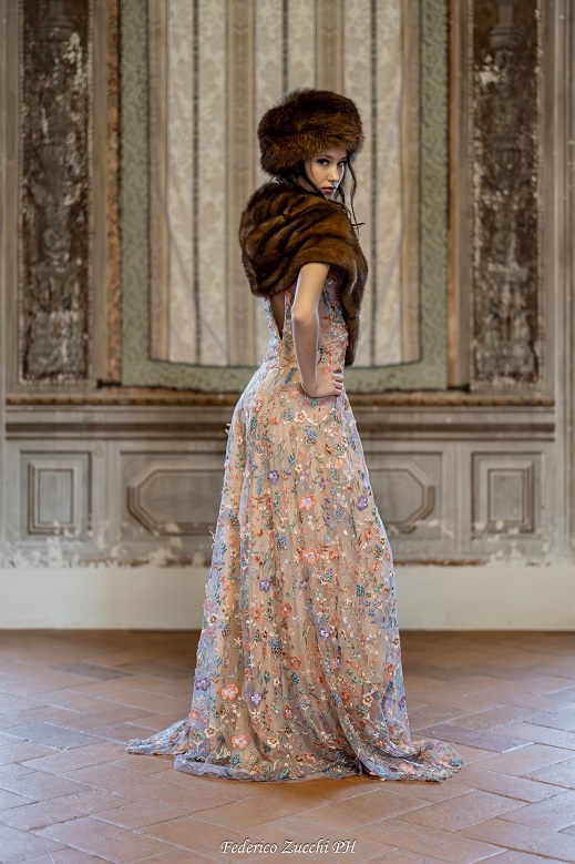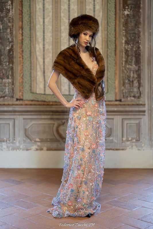 A seguire sulla maestosa scalinata del Palazzo Novello si sono avvicendate le modelle con gli abiti da sera sartoriali ed esclusivi del brand di Miriam Tirinzoni impreziositi con stole di visone e colbacchi in pelliccia di volpe. E qui si apre la scena per il passaggio tra le diverse generazioni delle pellicce affinché possano riprendere forma, stile e vita con le giovani ragazze che le possono indossare, custodire e tramandare, proprio per la loro preziosa origine animale.