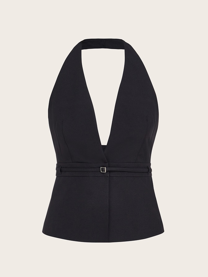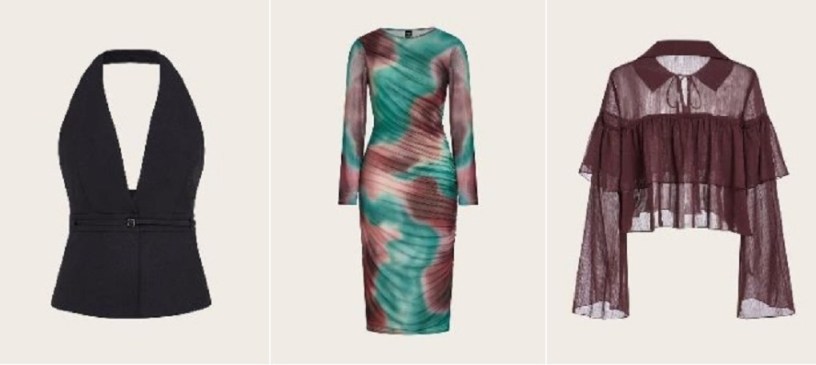 Accanto a questi, tessuti elasticizzati con effetti drappeggiati e dalle linee morbide e avvolgenti si intrecciano con elementi ricercati per dare vita a capi che valorizzano la silhouette con eleganza.