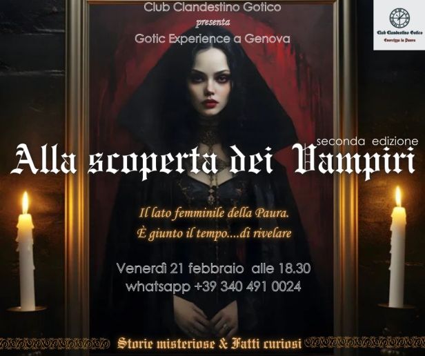 Genova, venerdì 21 febbraio, ore 18.30: nella sede prestigiosa di Genova Dreams, il Club Clandestino Gotico presenta il nuovo format ideato da Sophie Lamour “Alla scoperta dei Vampiri” con la seconda puntata dal titolo “Il lato femminile dei Vampiri a lume di candela” la prima goticexperience° a Genova assolutamente da non perdere.