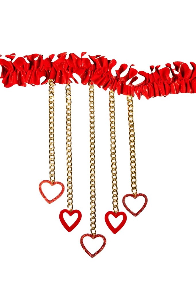 Come ogni festa che si rispetti anche San Valentino ha la sua regina, questa collana. Lunga, con catena gourmette e cuori, realizzati in plastica riciclata recuperata da scarti di utilizzo comune e colorati a mano, alcuni con finitura glitter che dona un tocco moderno e contemporaneo. Con arricciatura al collo, in pelle riciclata recuperata da scarti di lavorazione industriale, che crea interessanti punti luce diversi da ogni angolazione da cui si osserva il bijoux.