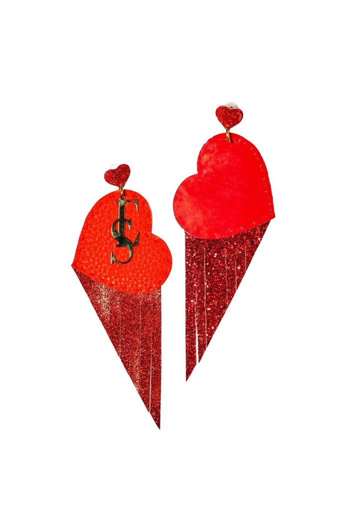Cuori di forma diversa per questi orecchini con frangia. Interamente tagliati, cuciti e lavorati a mano. Con parti in plastica riciclata e parti in pelle riciclata, recuperati rispettivamente da scarti di lavorazione comune ed industriale. Con una finitura glitter che dona un tocco moderno e contemporaneo.
