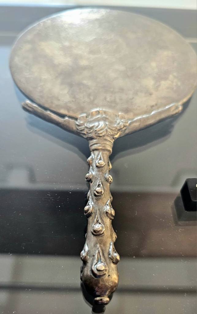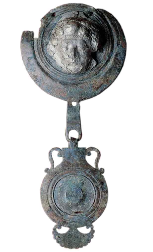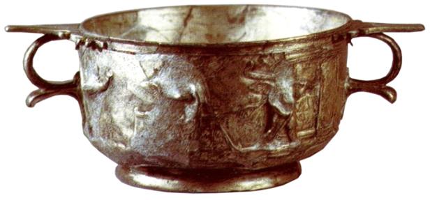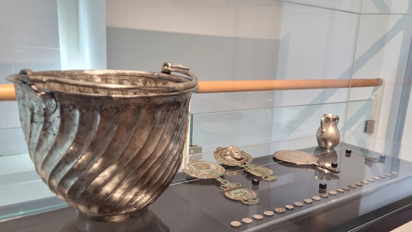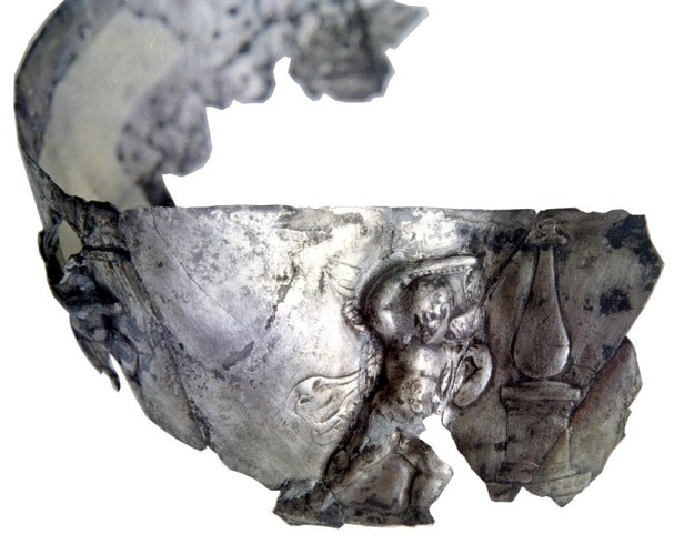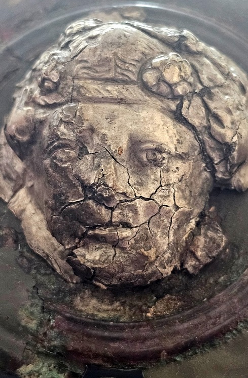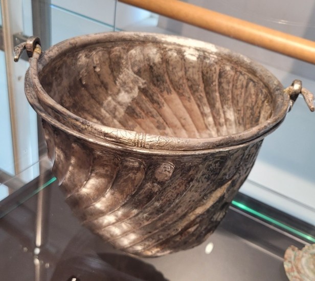 Non lontano erano gli oggetti da toletta, un’anforetta e uno specchio d’argento con manico a forma di clava ornato all’innesto da una pelle di leone, che alludeva ad Eracle e al mito di Onfale, la Regina della Lidia che lo tenne prigioniero come suo schiavo e amante. Poco distanti erano pezzi di argenteria da tavola: un secchiello (situla) con manico a testa di cigno, due coppe decorate con amorini e una falera (ornamento di pettorale per cavallo) con maschera dionisiaca in argento.