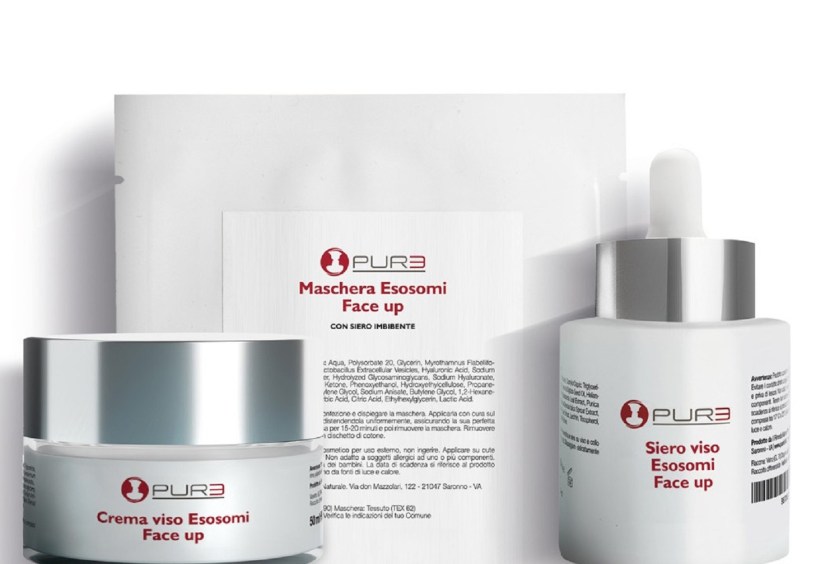 L’ultima novità in casa “Pure” è “Face Up” una linea dedicata al viso, a base di Esosomi, per un trattamento globale antiage, rigenerativo e rimpolpante. Gli Esosomi utilizzati da “Pure” sono di origine batterica con un alto assorbimento cutaneo e contengono proteine, DNA, lipidi e RNA messaggero; si tratta in particolare di sostanze in grado di stimolare la crescita tissutale e la rigenerazione cellulare svolgendo un potente effetto antiossidante e rimpolpante, oltre ad un’efficace azione antirughe, migliorando infine, anche l’elasticità cutanea.