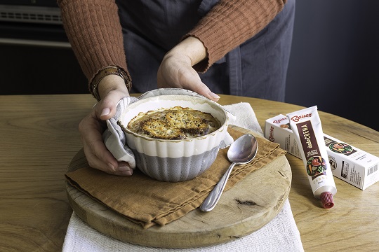 Nella lista ingredienti di Sonia Paladini per la ricetta della zuppa di cipolle c’è anche DADOCREMA Bauer gusto Carne, il dado in tubetto in formato crema, profumato, genuino e tutto natura. Il segreto per dare quel tocco in più alle fantasie culinarie!