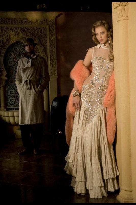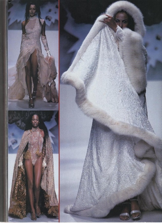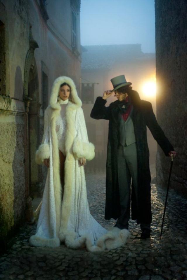 Tra i capi cult della collezione spicca una mantella bianca bordata di pelliccia, preziosissima di pizzo, interamente ricamata con cristalli, jais, swarovski, perline e paillettes.La palette cromatica vira dal nero profondo, al rosso, all’avario, fino alle sfumature del marrone.