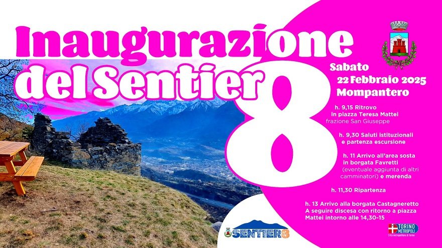 Il Comune di Mompantero in collaborazione con Città metropolitana di Torino inaugurerà il Sentier8 sabato mattina 22 febbraio con una camminata sul percorso: partenza ore 9.15 dalla frazione San Giuseppe e ripartenza alle ore 11.30 dopo la merenda.