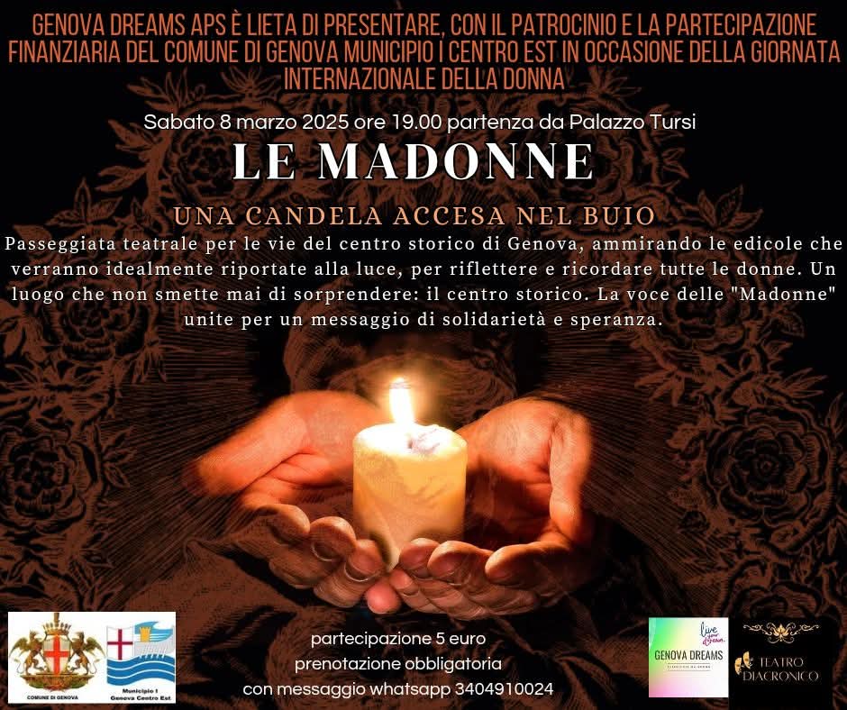 Il prossimo 8 marzo tour emozionante per vivere un’esperienza nel cuore del capoluogo ligure. Evento organizzato da Genova Dreams dove il pubblico sarà accompagnato dalle Madonne, talentuose attrici, che guideranno il racconto con uno storytelling emozionale.