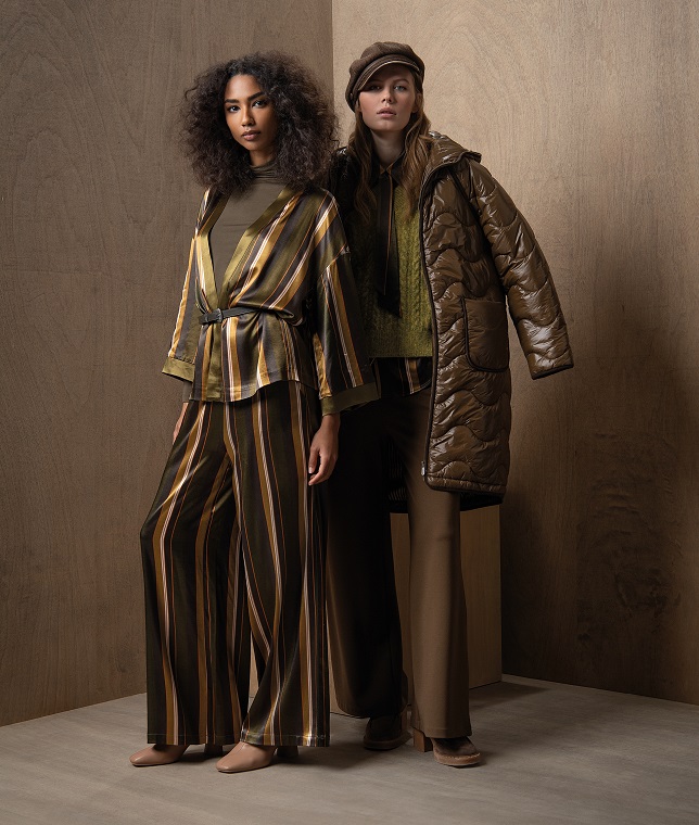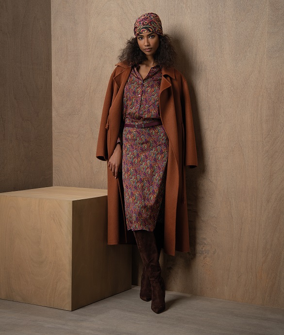 L’autunno di Surkana indugia sui colori e sugli ornamenti di Lhasa, la città proibita, e la sua magia è un abbraccio caldo sui toni aranciati e petrolio in dialogo con la fantasia paisley e il check acceso da tonalità inedite. Le linee sono classiche ma i dettagli allargano lo sguardo: è la maglia cocoon sui pantaloni rigorosi; la longuette con giacca cropped; la combo giacca e pantalone in velluto ammaliata dalla camicia vivace. Introspettiva ma con brio, Mani è una sinfonia che sboccia tra i verdi e i senape, si specchia nei giochi di maglia a zig-zag, sceglie il calore di maglie avvolgenti e mantelle- poncho, tra frange e fantasie animalier. Sono vibrazioni luminose come i riflessi degli abiti e dei due pezzi scivolati; sono le suggestioni dei Mandala, riletti dai geometrismi che firmano i capi fluidi, vessillo di una femminilità dinamica, in cui non mancano i nuovi power suit riletti da texture nuove e cromaticamente intense, dove l’arcobaleno di blu e di grigi diventa una dichiarazione di intenti. Irbis, il leopardo delle nevi, è pura energia urbana, che cattura l’eleganza nei capi dal taglio sartoriale – i cappotti, i due pezzi – e li rianima con la forza di motivi le cui sfumature cromatiche sono vibranti e intense.
