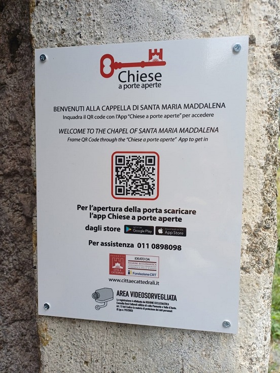 “Chiese a porte aperte” è il progetto che consente di visitare autonomamente i beni culturali ecclesiastici del Piemonte e della Valle d’Aosta con l’ausilio delle nuove tecnologie. L’applicazione gestisce molteplici operazioni dalla prenotazione della visita all’apertura automatizzata della porta: una volta effettuato l’accesso tramite QR si viene guidati alla scoperta del bene al suo interno.
