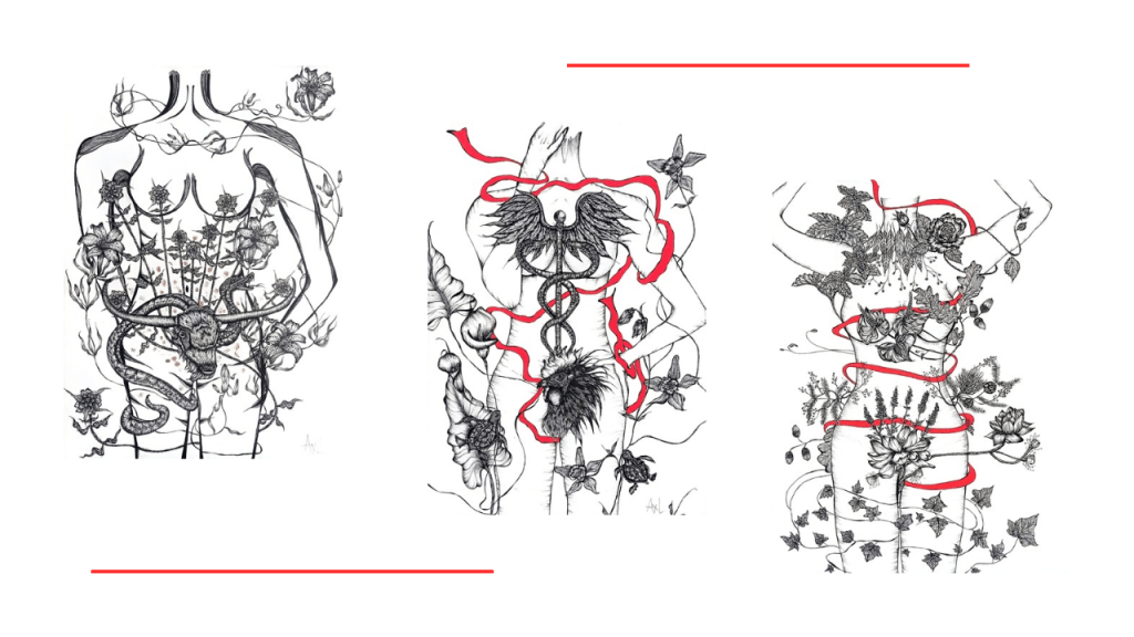 - Sarà un trittico che rappresenterà 3 aspetti salienti della donna. Il primo riguarderà la maternità, il secondo l’autoerotismo ed il terzo non lo so ancora… non ho le idee chiare. Sento che devo farlo. Sono già partita con le ricerche per quanto riguarda l’aspetto simbolico e ci saranno china, foglia oro e rosso.