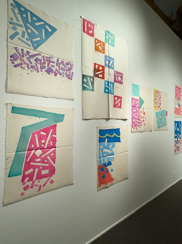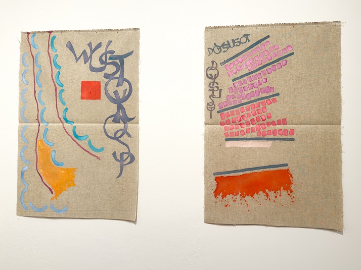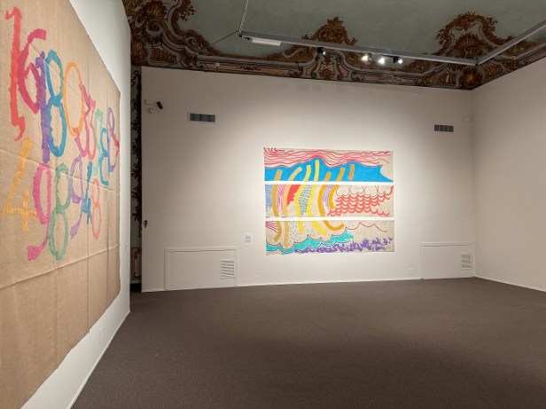 Nella seconda sala l’artista crea un repertorio di “Segni primari”: lettere di un alfabeto, tratti elementari organizzati in modo naturale affinché linee, colori e parole si dispongano sulla tela quasi fossero una melodia.