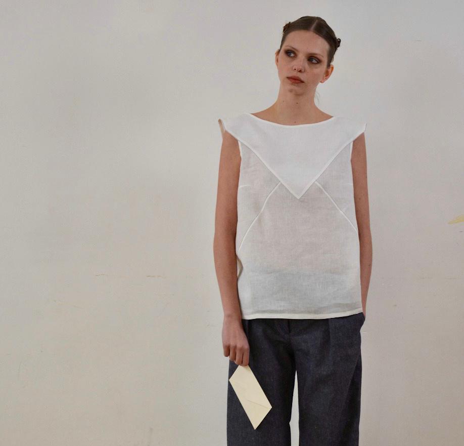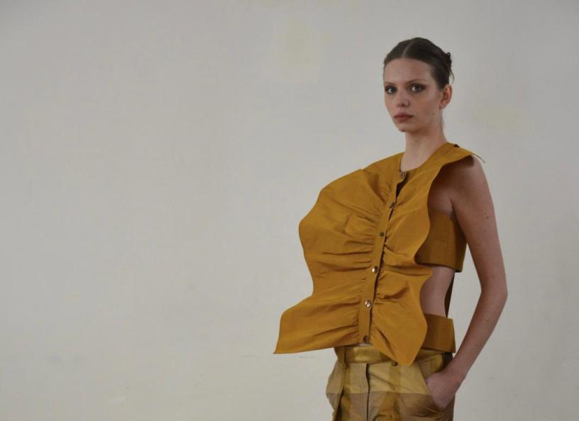 Fino ad arrivare alla pre-sera nei toni del bianco, dell’ocra e dei gialli con la tuta doppia con il fondo chiuso a coulisse che evoca un pigiama da sere d’estate e al top decorato con una vistosa rouche che sembra osservata con una lente di ingrandimento e strutturato a gabbia sul retro.