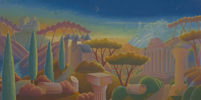 L’artista costruisce scenari che emergono da una dimensione sospesa, in cui memoria e visione si fondono in un equilibrio delicato. Nei suoi dipinti, il confine tra passato e presente, realtà e immaginazione si dissolve, dando vita a un dialogo profondo tra paesaggi metafisici e rimandi alla società contemporanea.