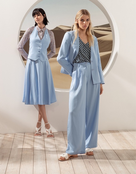 Il look Tanja si esprime attraverso maxi gonne fluide o pantaloni palazzo, accompagnati da bluse leggere in tessuti naturali.