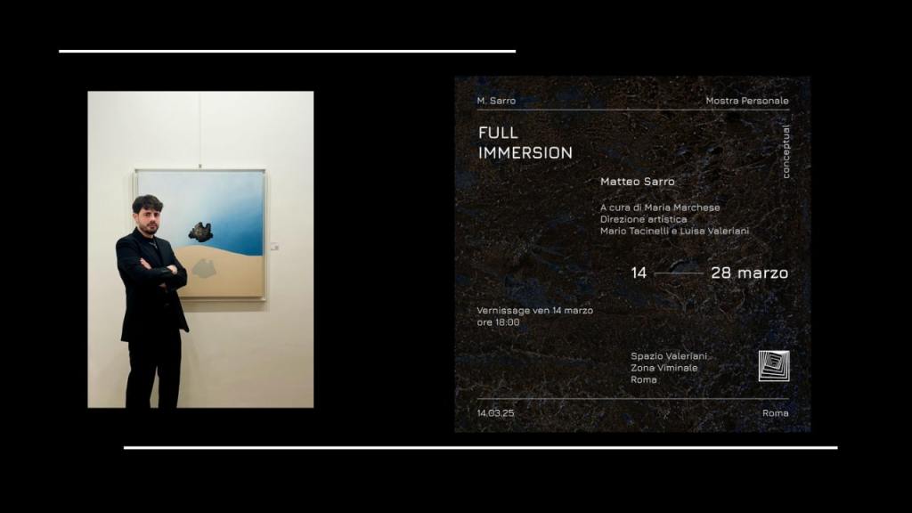 Il 14 marzo è stata inaugurata “Full Immersion” (visitabile fino al 28 marzo), la prima mostra personale di Matteo Sarro : un’immersione totale tra le opere e tra i consensi del pubblico presente, intervenuto numeroso presso lo Spazio Valeriani, che ne decretano il successo. Con – geniale l’allestimento ideato dall’artista e dalla curatrice Maria Marchese , dove l’apposizione di specchi tra le opere ha sortito l’effetto desiderato, ossia di azzerare il confine tra le persone ed i manufatti, tra la vita quotidiana e l’arte, tra pensiero e materia. Sono 14 le opere presenti in mostra – tele, sculture ed oggetti di design – che raccontano il percorso artistico di Sarro, dagli esordi ad oggi. Esse convincono innanzitutto per la cifra distintiva dell’artista, che denota una personalità “esotica”, intesa come squisita capacità di esplorare e sperimentare l’inconsueto, traducendolo, poi, in creazioni che seducono esteticamente e psicologicamente.