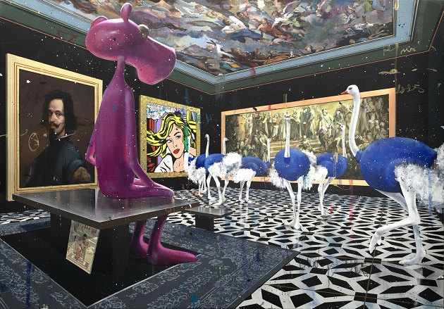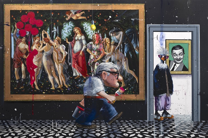 “Il bravo artista copia, il grande artista ruba” diceva Picasso, è così che il maestro del citazionismo, Angelo Accardi, decide di “saccheggiare” il cartone preparatorio della Scuola di Atene di Raffaello e restituirlo al visitatore attraverso la lente deformante e il linguaggio irriverente del pop surrealismo. Da qui nasce Art Crimes con la sua “Scuola di Atene”: un pantheon contemporaneo dove Duchamp, Bacon, Velázquez, Dalì, Warhol, Cattelan, Picasso si aggiungono agli artisti ritratti da Raffaello, introducendo elementi ludici in percorso straniante, istruttivo e divertente, alla ricerca dell’ineffabile genio creativo.