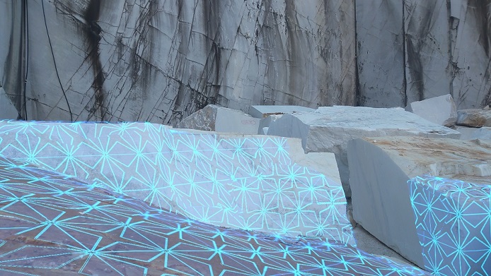 Stars and Dust è un viaggio che lo spettatore fa tra forme e materiali diversi, a partire dal marmo, simbolo di Carrara, materiale duro, resistente e eterno che si trasforma in modo sorprendente fino a diventare tessuto e supporto digitale. Al centro dello spazio, l’opera Wrapped Marble, scultura ambientale dalla forma ellittica creata con un particolarissimo tessuto composto con la polvere di marmo, è un invito per i visitatori ad entrare dentro la materia, non solo con la vista, lasciandosi avvolgere ed interagendo con essa.
