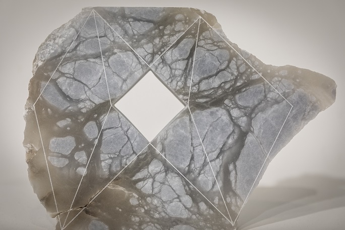 Il percorso espositivo si apre con cinque alabastri incisi e forati, intitolati ‘Shadows Stone’, che si aprono alla luce lasciando vedere “oltre”. Su una parete, i due lavori della serie Fold Star Marble rivelano degli origami traslitterati in marmo, qui piegato e sfaccettato; sull’altra, due coppie di dittici in onice verde e bianca appaiono come fogli sospesi. L’artista utilizza, tra le varie tipologie, il marmo explosion blue che si presenta quasi come una pelle di leopardo. Il marmo nero del Belgio è stato scelto per la stele forata Burning Stones. Oltre alla parte oggettuale della mostra, Vincenzo Marsiglia sperimenta il digitale. Servendosi di Hololens2, un visore di mixed reality sviluppato da Microsoft per l’industria e la chirurgia, applicato per la prima volta all’arte da Vincenzo Marsiglia, nasce l’opera in divenire Map (Star) the World (2020 – in corso). Indossando la maschera, l’occhio viene catturato e lo sguardo genera una sorta di “pelle stellare” sugli oggetti e su qualsiasi cosa osservi. L’occhiale fa scaturire una visione ogni volta nuova fatta dell’interazione, unica e irripetibile, tra l’artista e ciascun spettatore. Nella parte finale del percorso espositivo, si possono inoltre osservare gli scatti fotografici realizzati con Hololens2 e un video inedito accompagnato dalla colonna sonora ideata per l’occasione dal compositore Ocrasunset, proiettato su lastra di marmo bianco, esito della ricerca che Marsiglia ha sviluppato a Carrara.