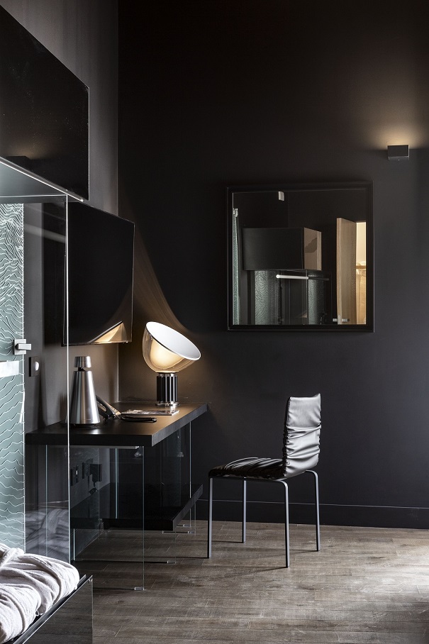 La suite Abissi, nera e sensuale come un abisso marino, si arricchisce di un’opera muraria realizzata con 700 cotti artigianali firmati Cerasarda. Posizionata sulla terrazza, l’installazione simboleggia il passaggio dalle profondità marine alla luce del Mediterraneo, grazie a otto sfumature di blu che creano un suggestivo effetto tridimensionale. Sullo sfondo il Golfo di Cagliari e la Basilica di Bonaria per un’unica, coinvolgente esperienza visiva.