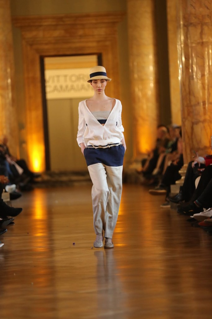 E ancora la nota passione della principessa per lo sport viene evocata da capi sportivi nei toni del blu, bianco e corda abbinati a scarpe traforate realizzate da Lella Baldi su disegno di Camaianie cappelli a calotta, il tutto con un’impronta Anni Venti.